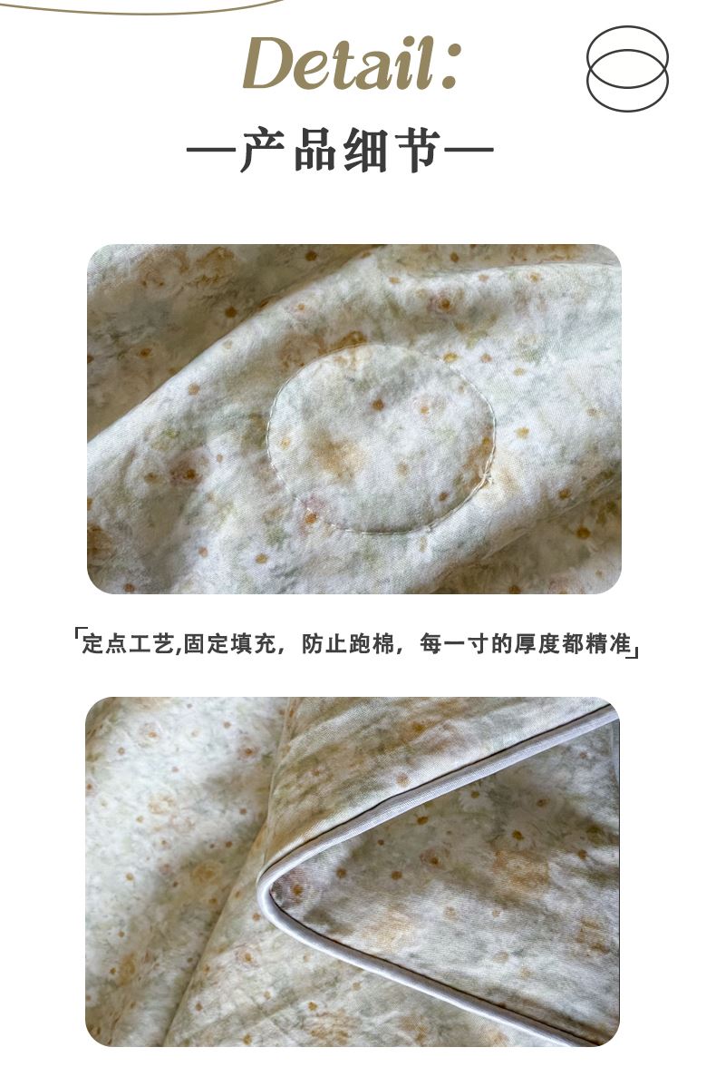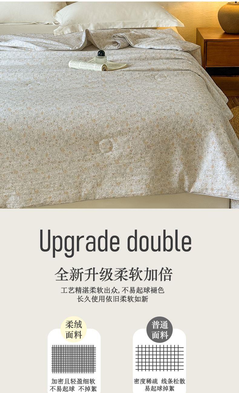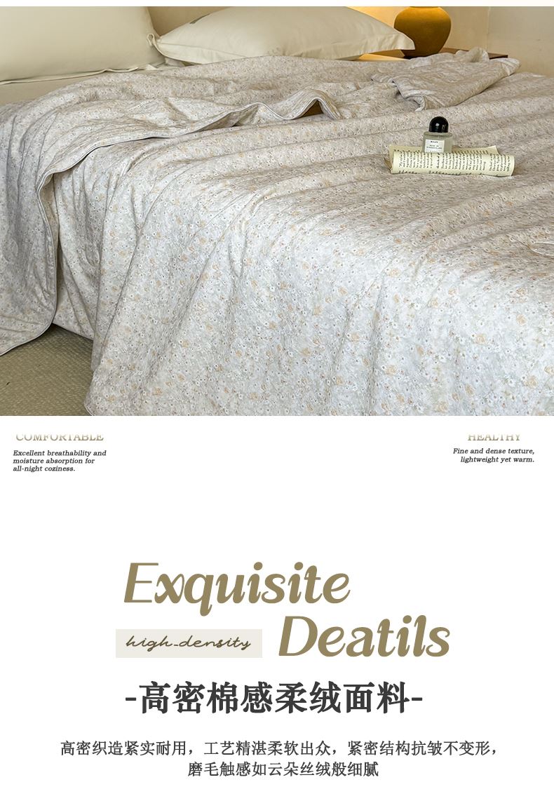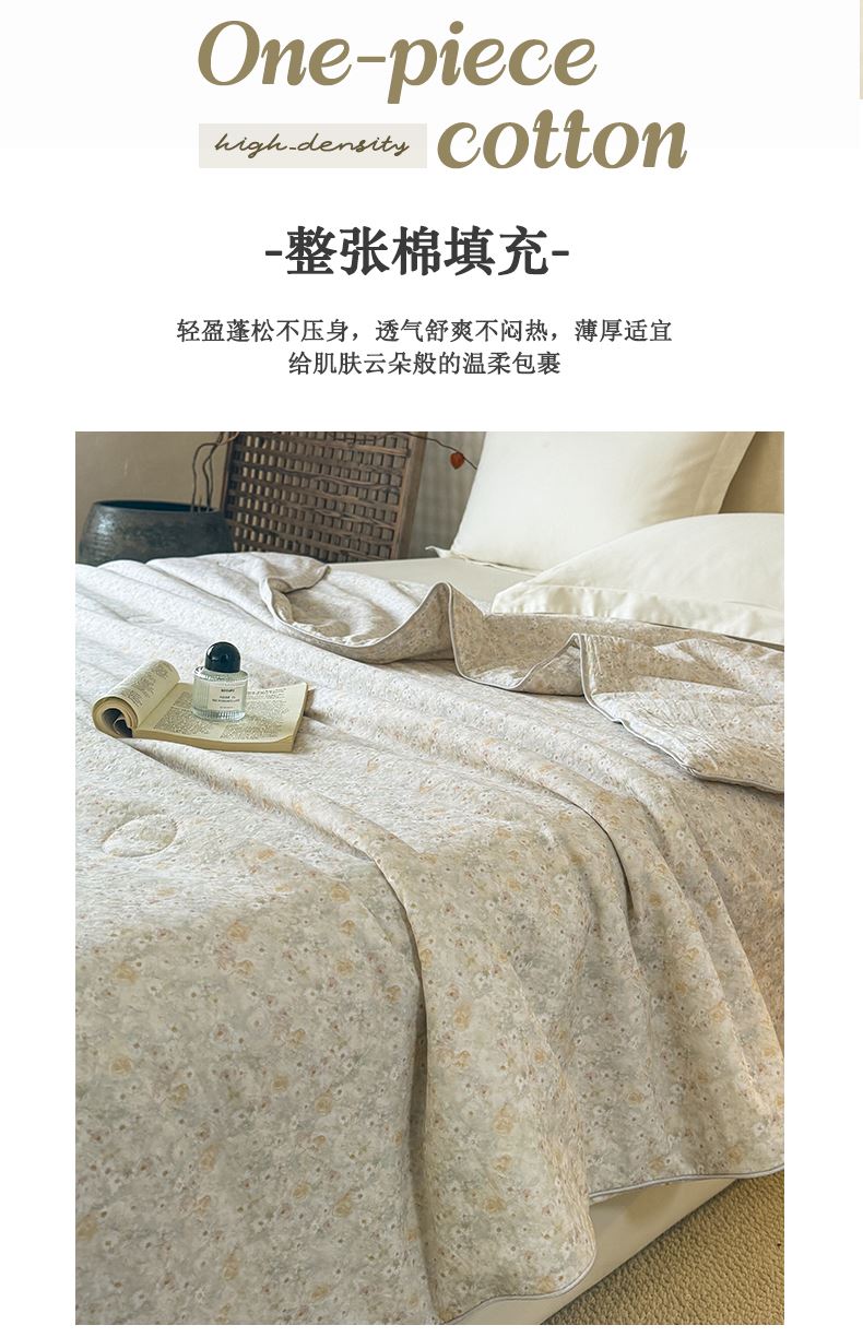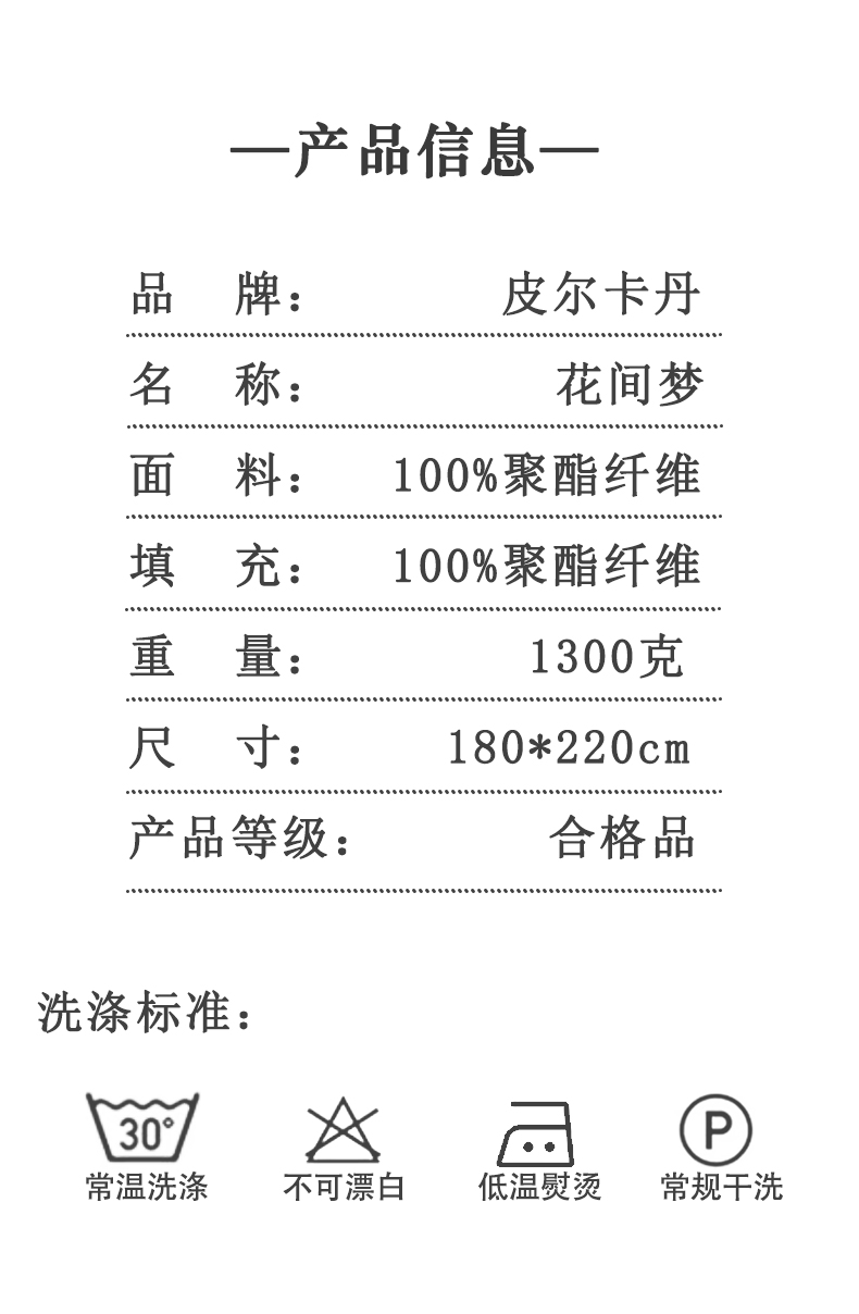 产品参数: 面料:10 0%聚酯纤维 填充:10 0%聚酯纤维 重量:1300克 尺寸: 180*220cm 产品等级:合格品 产品卖点: 采用数码印染,色彩更丰富,不易褪色美观大方,不含甲醇,绿色健康更环保