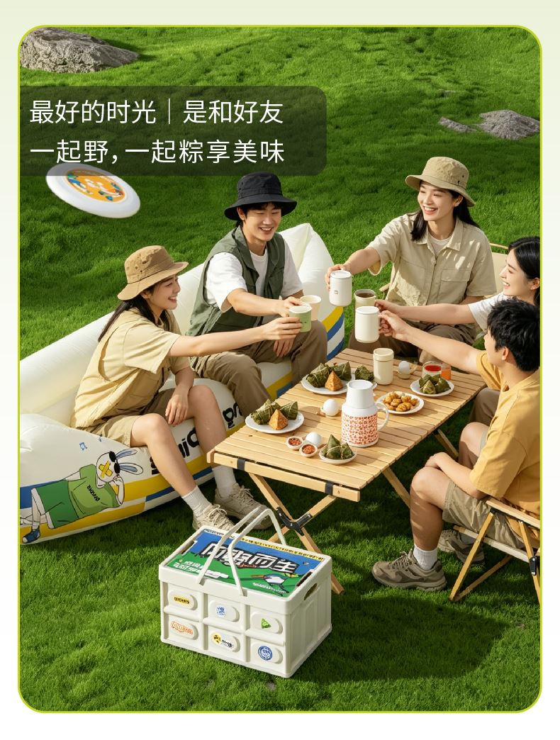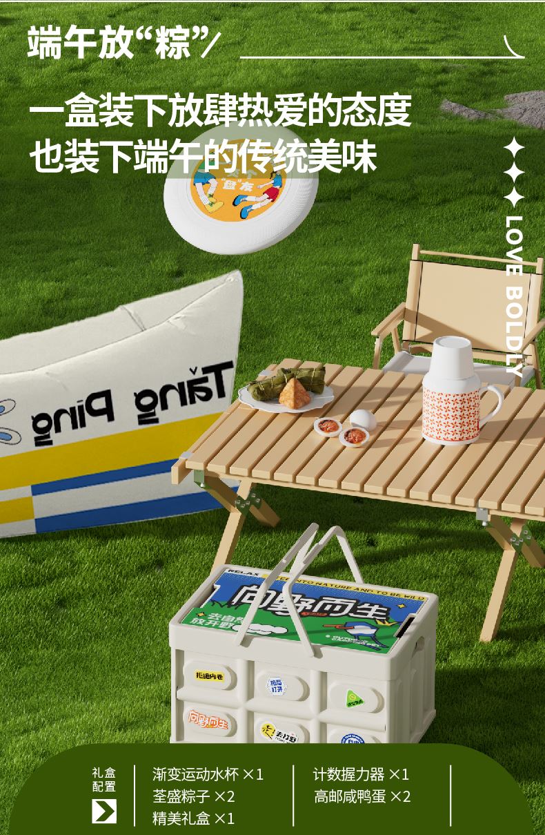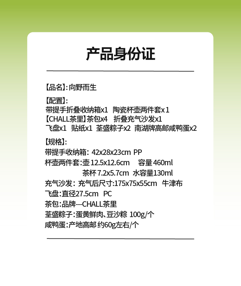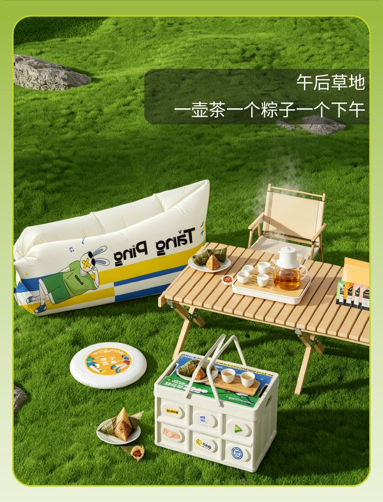 礼盒配置:带提手折叠收纳箱*1 陶瓷杯壶两件套* 1 【CHALL茶里】茶包*4 折叠充气沙发*1、飞盘*1、贴纸*1 荃盛粽子*2、南湖牌高邮咸鸭蛋*2