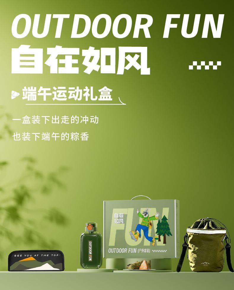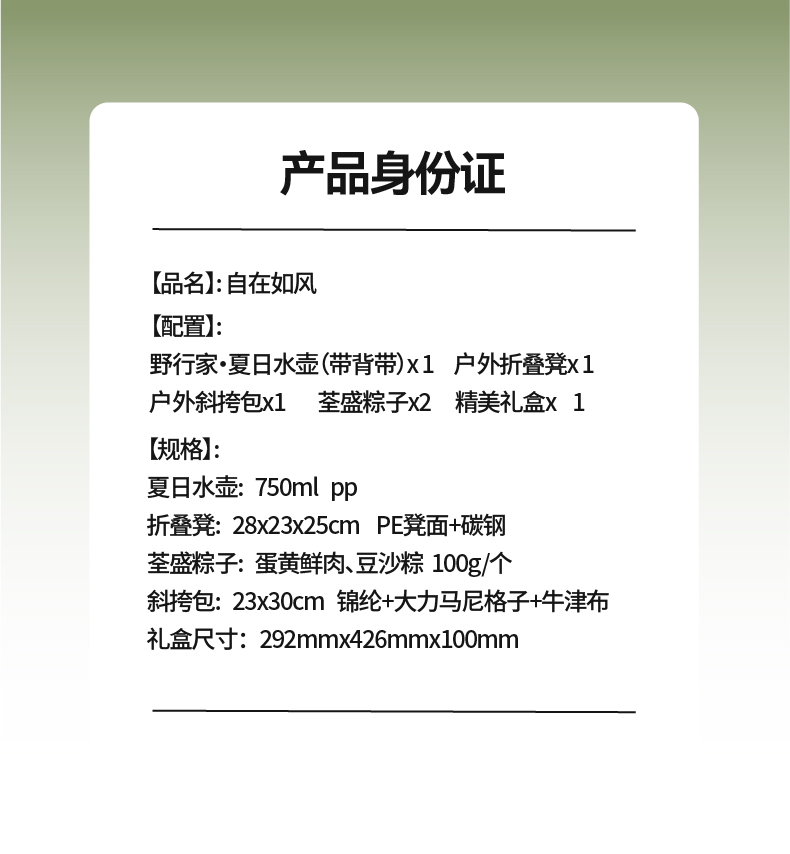 礼盒配置:野行家·夏日水壶(带背带)* 1 户外折叠凳* 1、 户外斜挎包*1 荃盛粽子*2、精美礼盒* 1