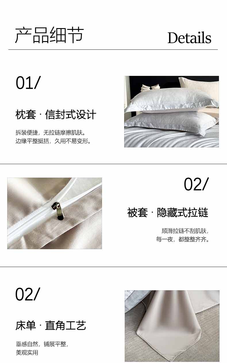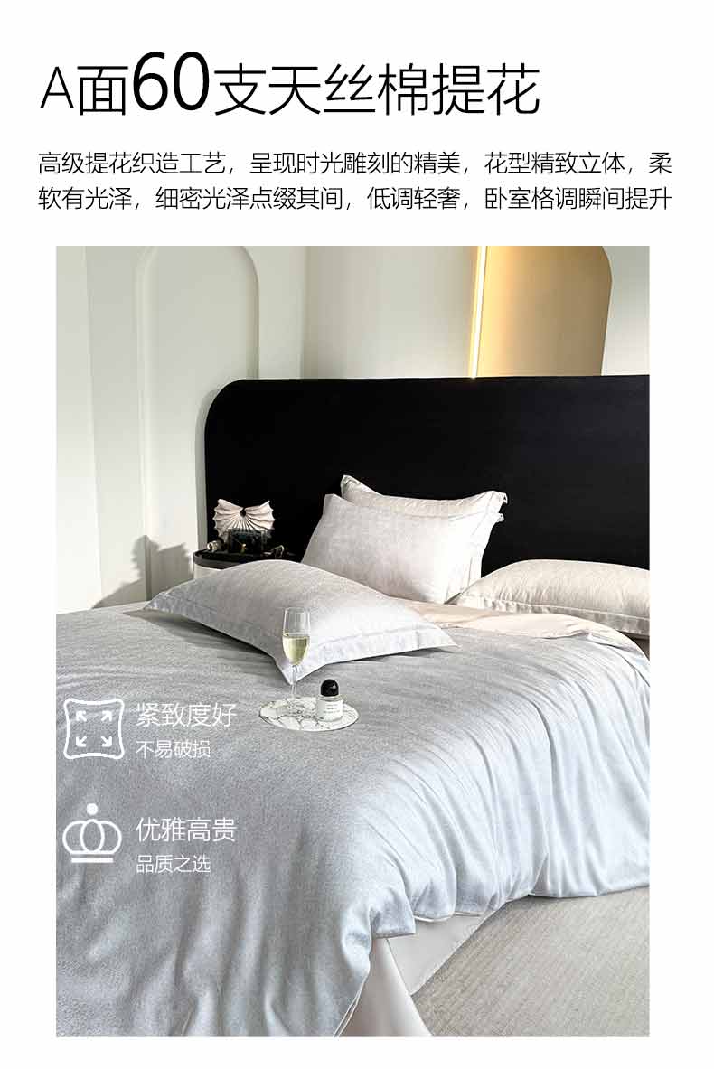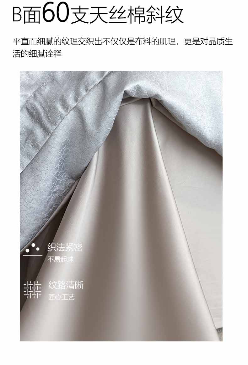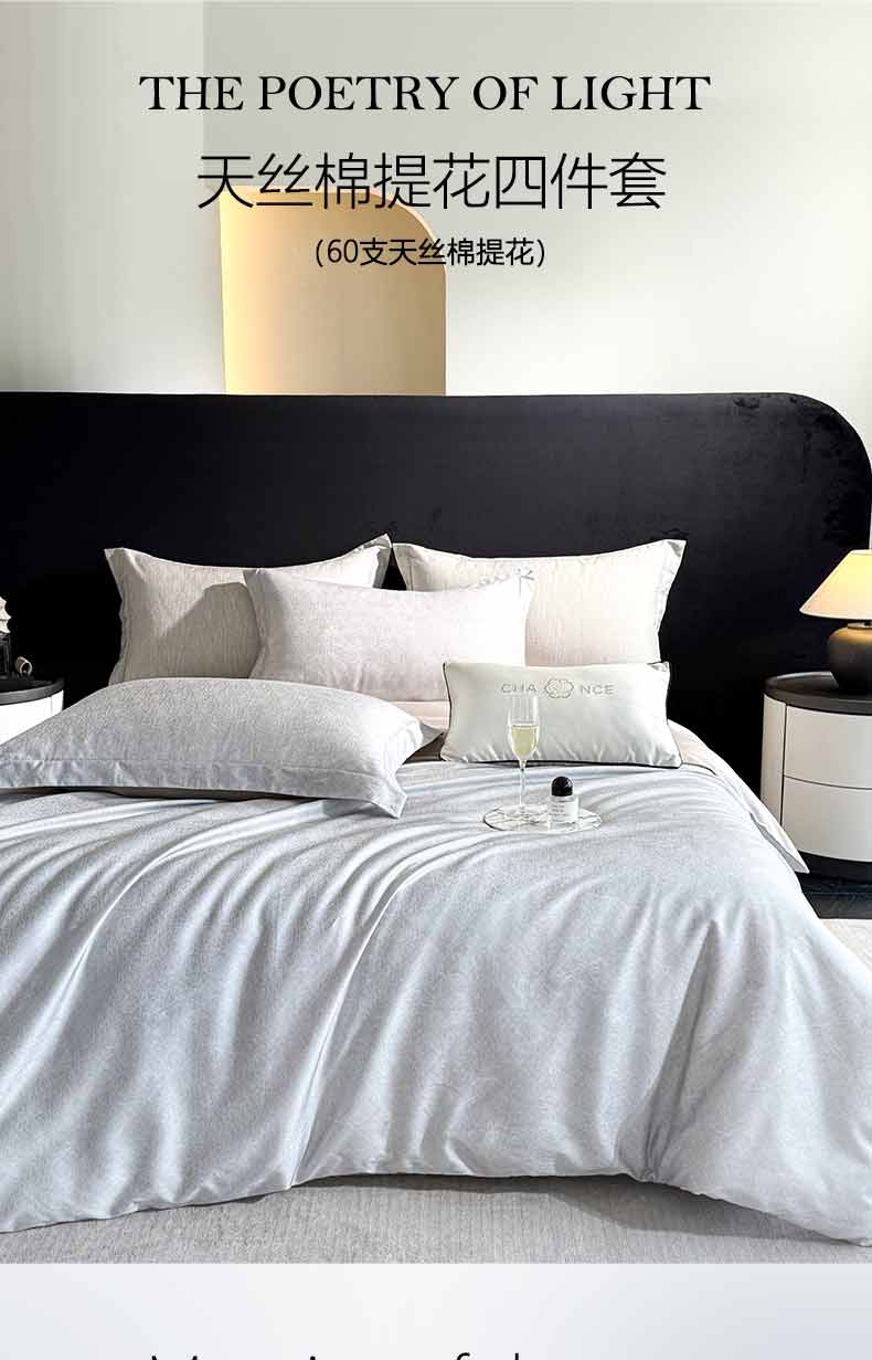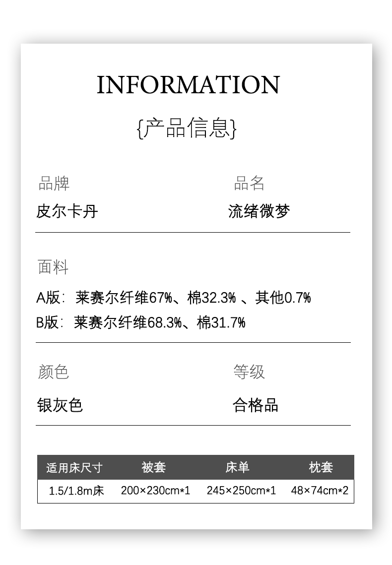 产品参数: 面料:A版:60支天丝棉提花 B版:60支天丝棉 工艺:提花+亮丝面料 规格: 被套200*230cm 床单245*250cm 枕套48*74cm*2只 产品等级:合格品 产品卖点: 采用天丝棉面料。A版采用独特的天丝棉提花+亮丝镶嵌,更显大气。