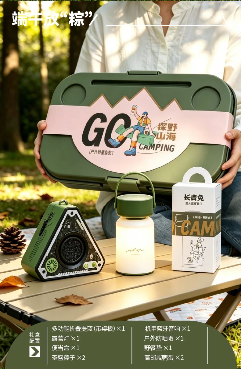 礼盒配置:多功能折叠提篮(带桌板)*1 露营灯* 1、便当盒* 1、野餐垫*1 机甲蓝牙音响*1、户外防晒帽* 1 荃盛粽子*2、南湖牌高邮咸鸭蛋*2