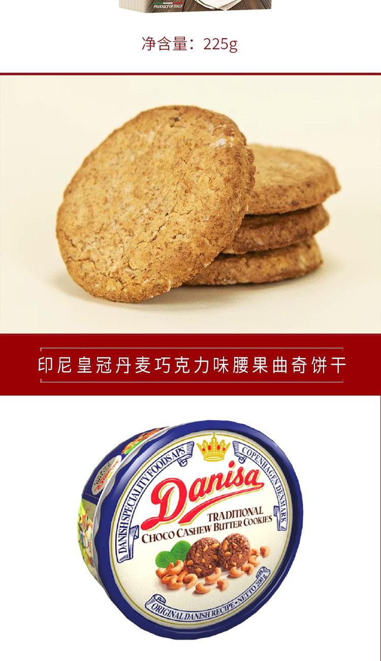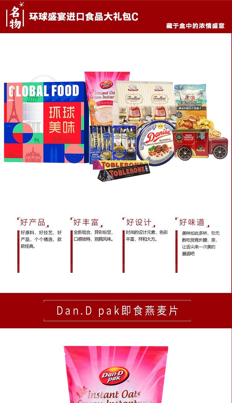 英国沃尔克斯什锦太妃糖(130周年纪念版红色)158g 瑞士三角牛奶巧克力(含蜂蜜及巴旦木糖)100g 瑞士三角黑巧克力(含蜂蜜及巴旦木糖)100g 意大利维趣多可可榛子味饼干225g 意大利维趣多全麦饼干225g 印尼皇冠丹麦巧克力味腰果曲奇饼干200g罐装 越南茜贡小姐综合蔬果干200g 马来西亚滴朵蓝山风味咖啡90g 马来西亚滴朵原味白咖啡90g 越南进口丹帝即食燕麦片1000g 精美包装盒:360*360*190mm
