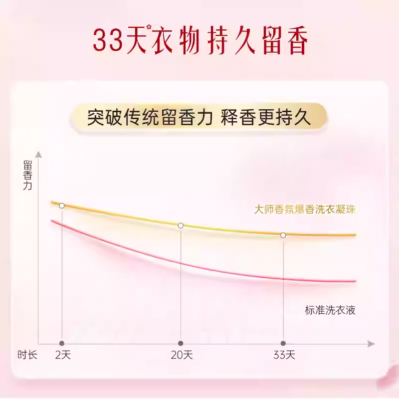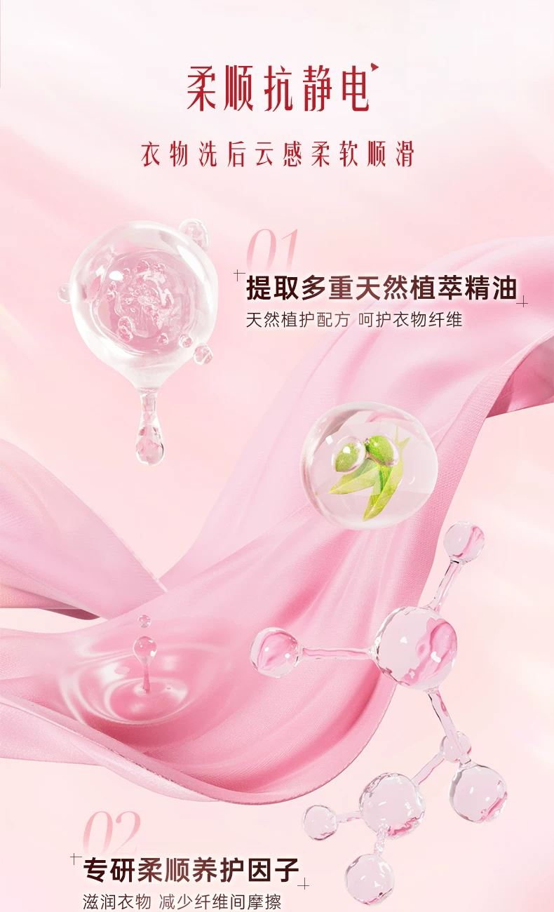 保质期限:3年 产品成分: 表面活性剂(含椰子油精华、橄榄油精华)、助剂(含稳定剂、污垢分散剂)、酶制剂(天然酵素)、香精、着色剂、爆香精粹粒子、柔顺因子 产品功效: 6效合1:33天留香、12倍浓缩更洁净、6大异味祛除、纳米级护色科技、亲肤抗静电、柔顺不发硬;15分钟快洗无残留