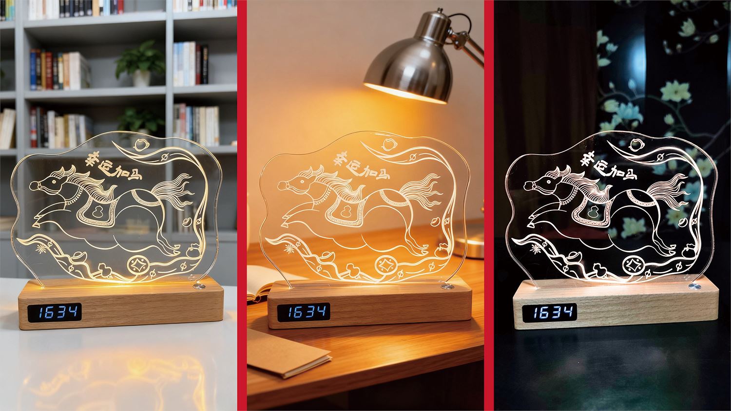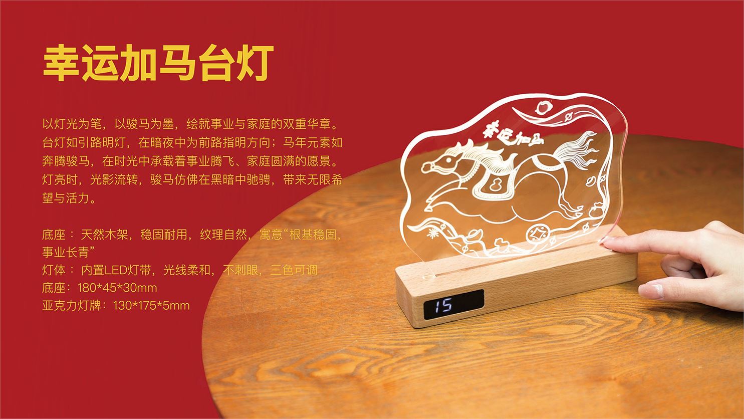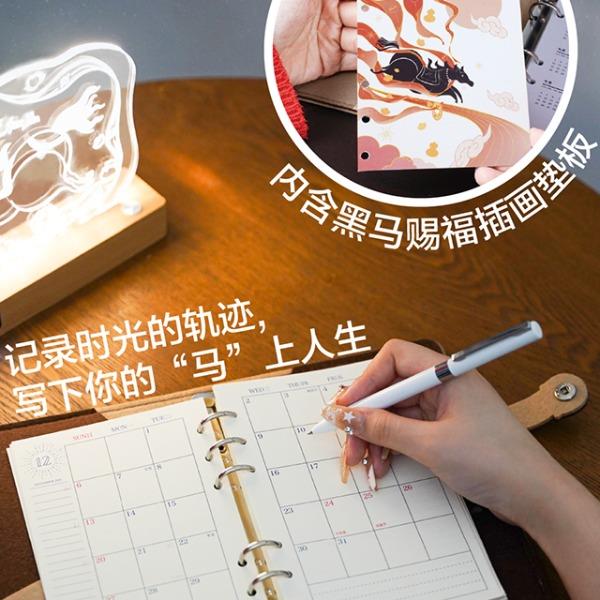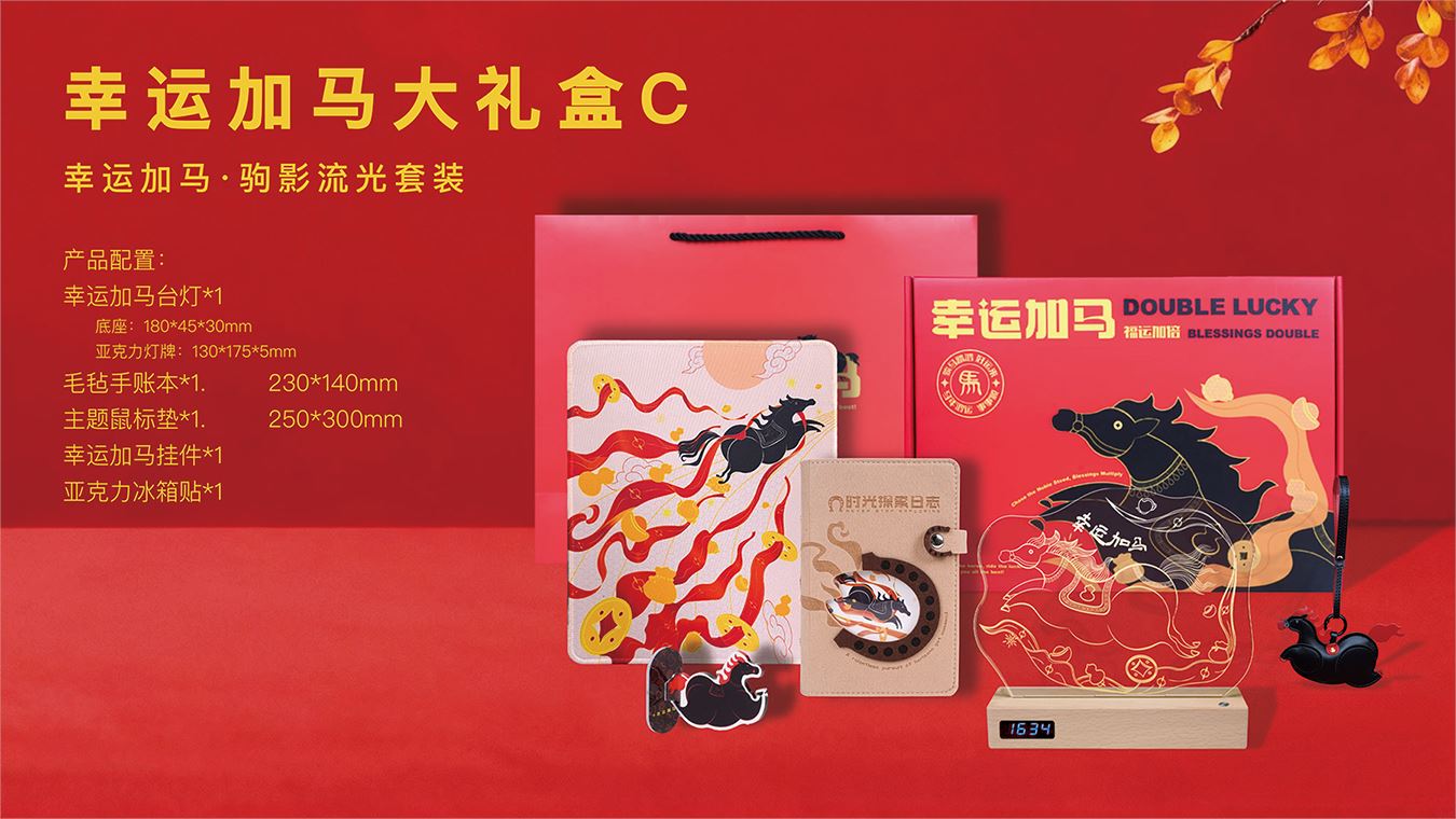 幸运加马台灯*1 底座:180*45*30mm 亚克力灯牌:130*175*5mm 毛毡手账本*1. 230*140mm 主题鼠标垫*1. 250*300mm 幸运加马挂件*1 亚克力冰箱贴*1